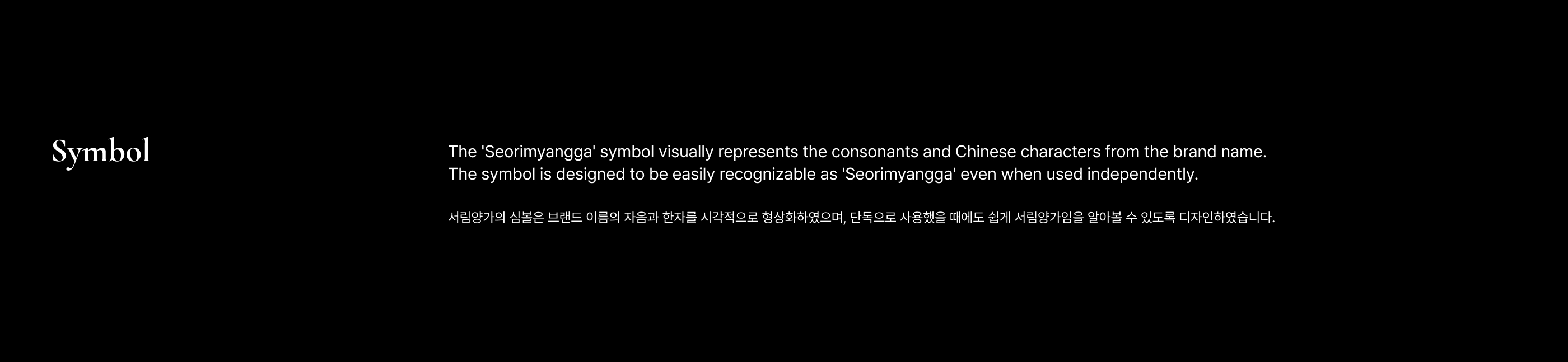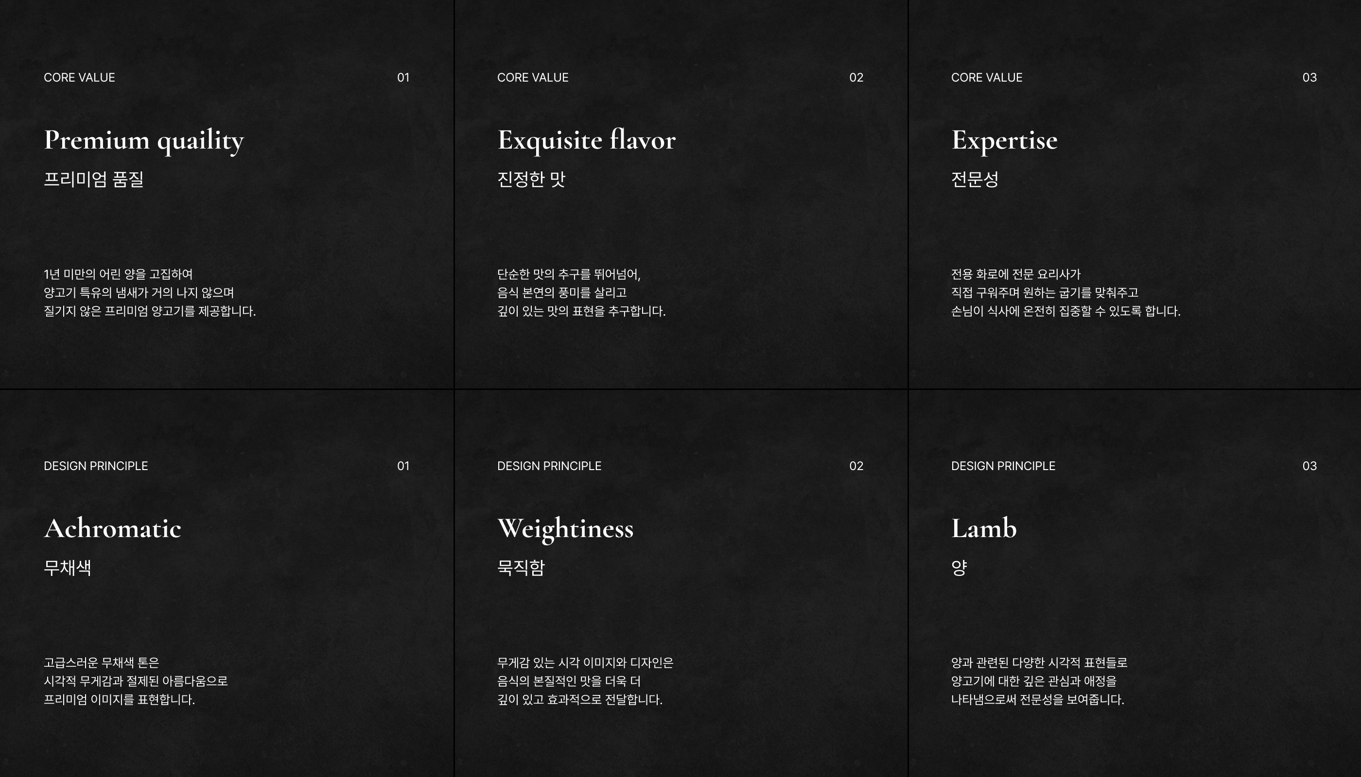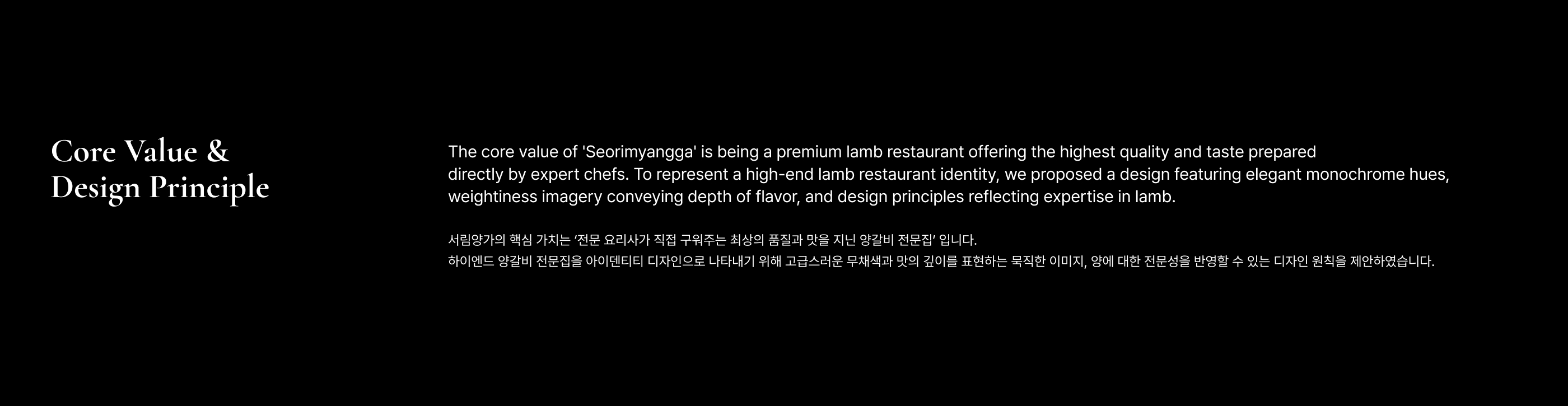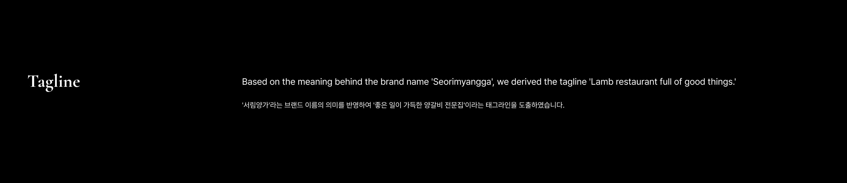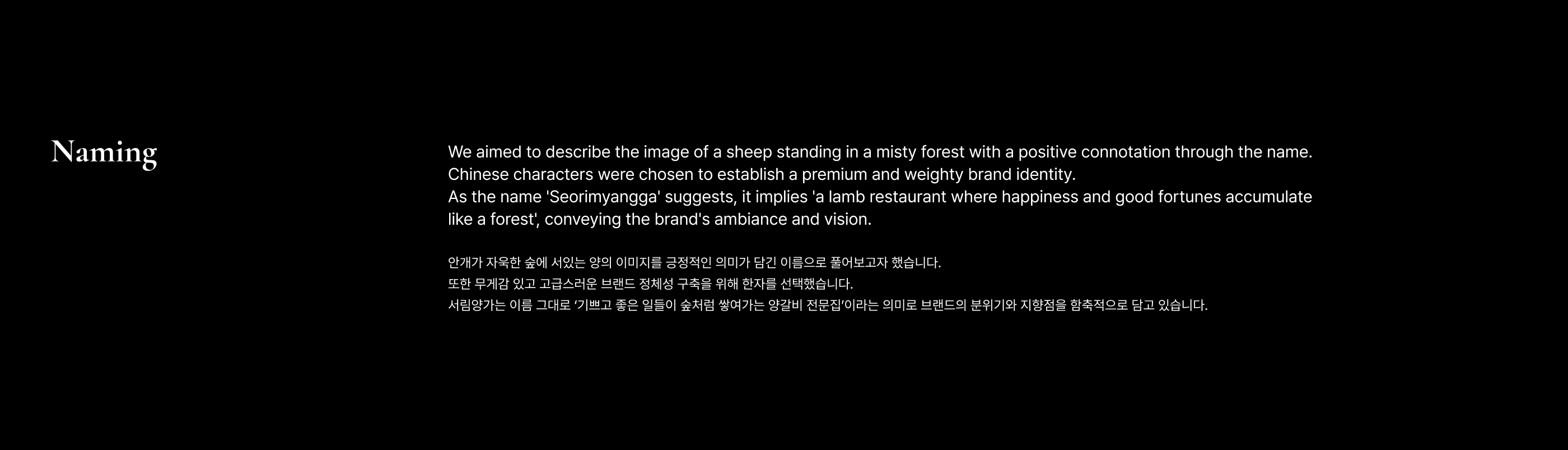 Overview Seorimyangga is a high-end lamb restaurant featuring the utmost taste and quality. To effectively communicate Seorimyangga's value to many people, we have established an identity system. 서림양가는 최상의 맛과 품질을 갖추고 있는 하이엔드 양갈비 전문집입니다. 많은 사람들에게 서림양가의 가치를 전달할 수 있도록 아이덴티티 시스템을 구축하였습니다.