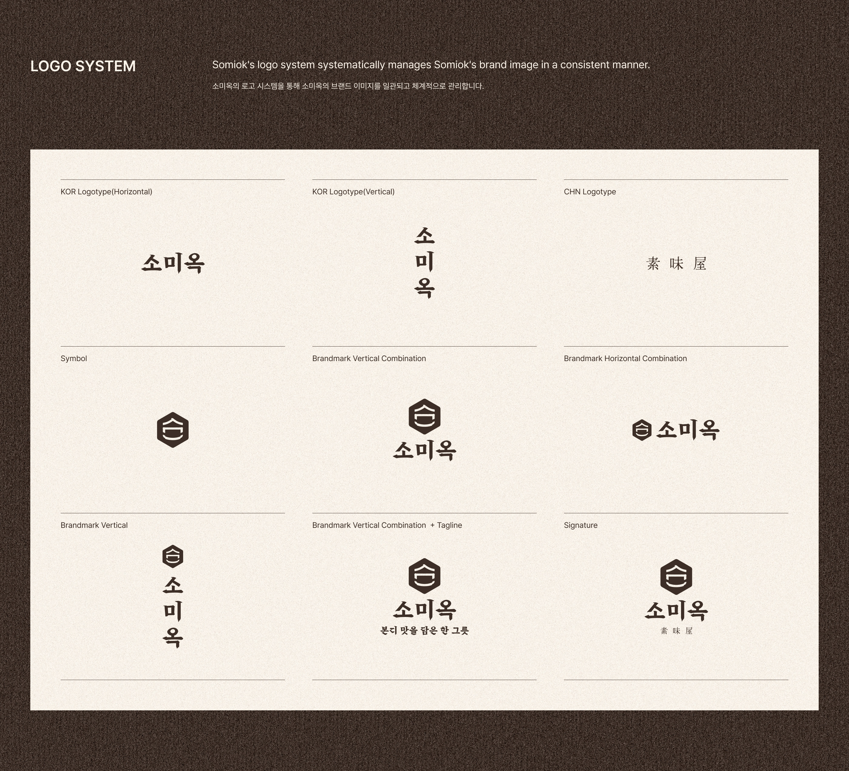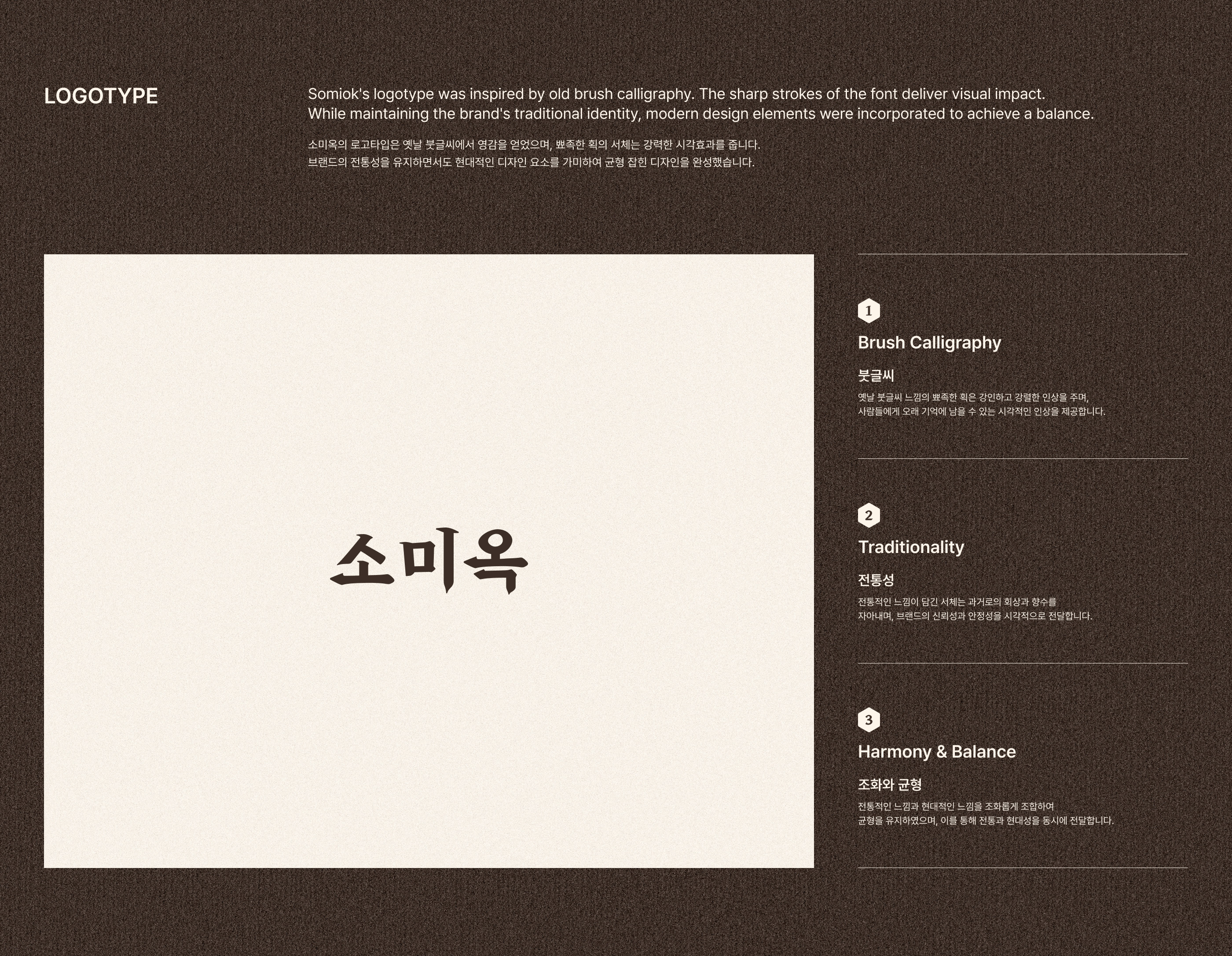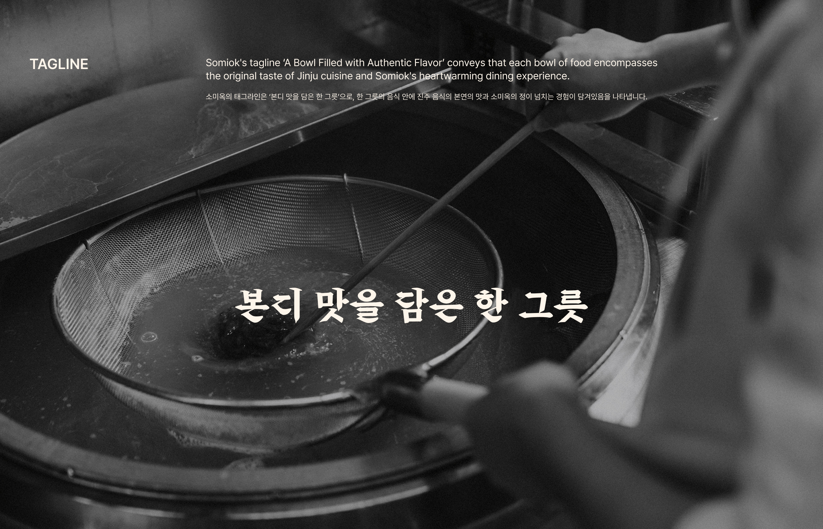Overview Somiok is a restaurant that serves signature Jinju dishes like Jinju naengmyeon and Jinju yukhoe bibimbap that carry the original flavor of Jinju cuisine. Currently operating multiple chain stores in various areas, Somiok plans to continue expanding chains in the future. Accordingly, to establish a unique brand identity prior to expansion, we have launched this branding project. 소미옥은 진주 냉면, 진주 육회비빔밥 등 본디 진주 음식의 맛을 간직한 음식점입니다. 현재 여러 지역에서 체인점을 운영 중에 있으며, 앞으로 계속해서 체인점을 확장할 계획입니다. 이에 앞서 고유한 브랜드 아이덴티티 정립이 필요함에 따라 프로젝트를 진행하였습니다.
