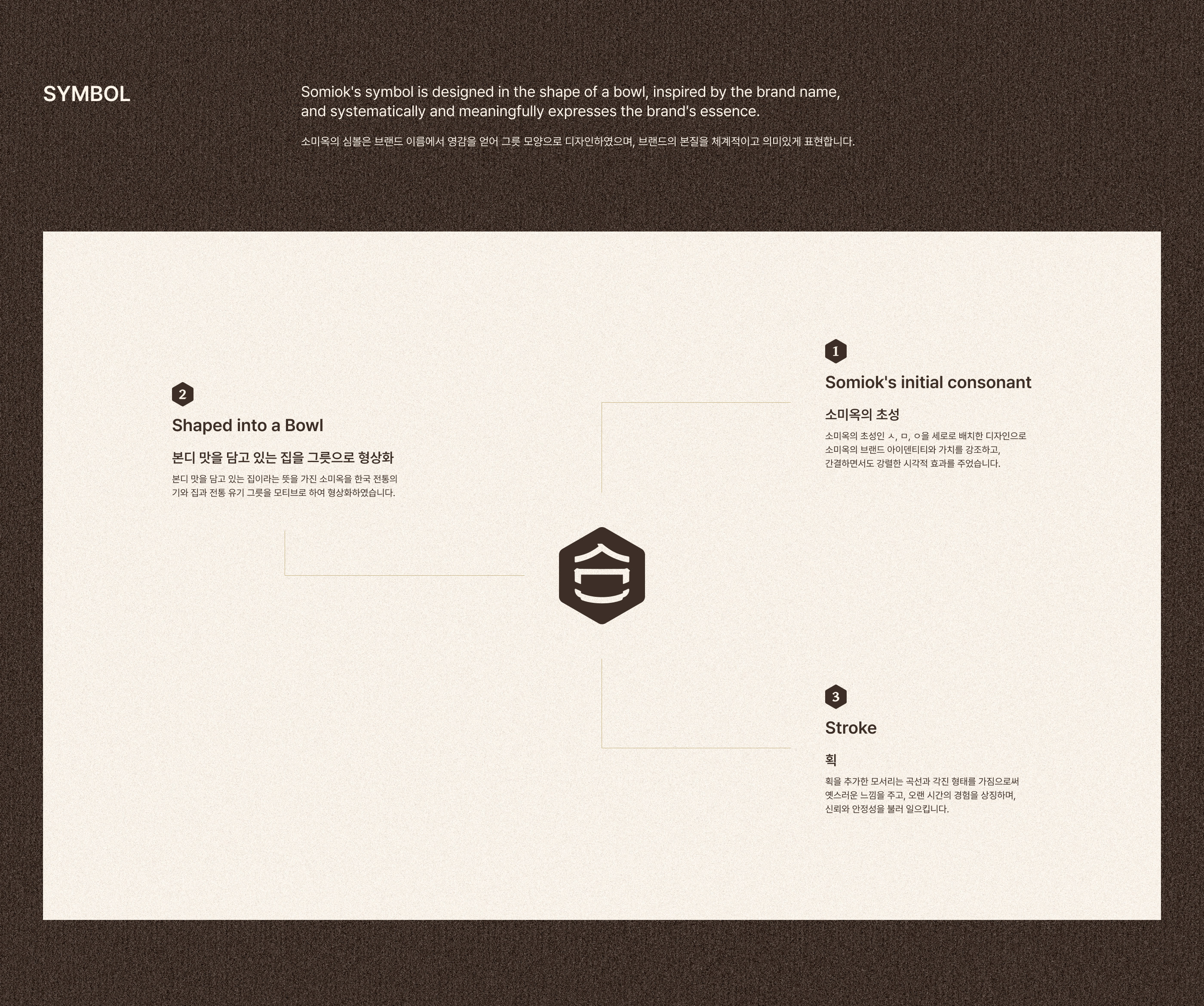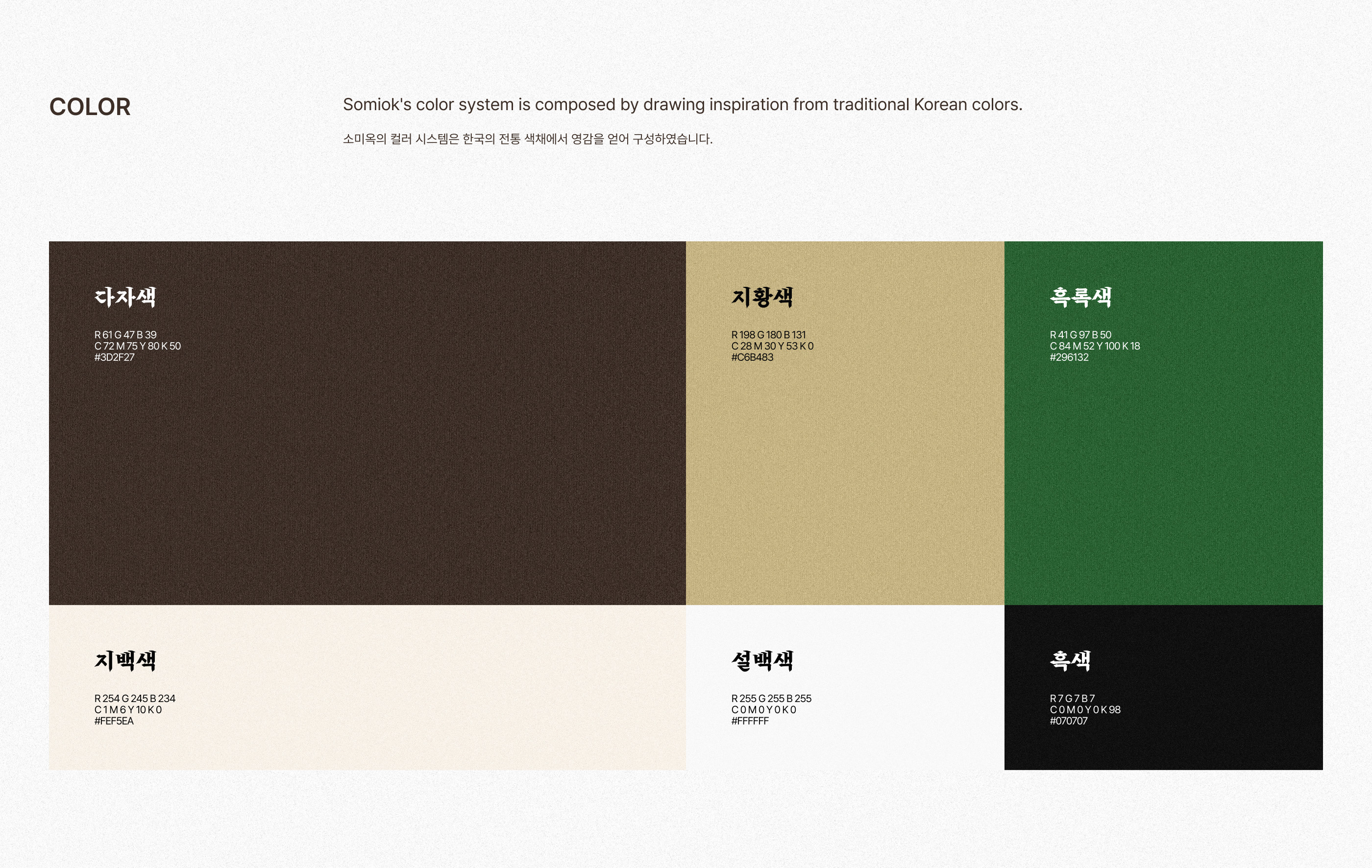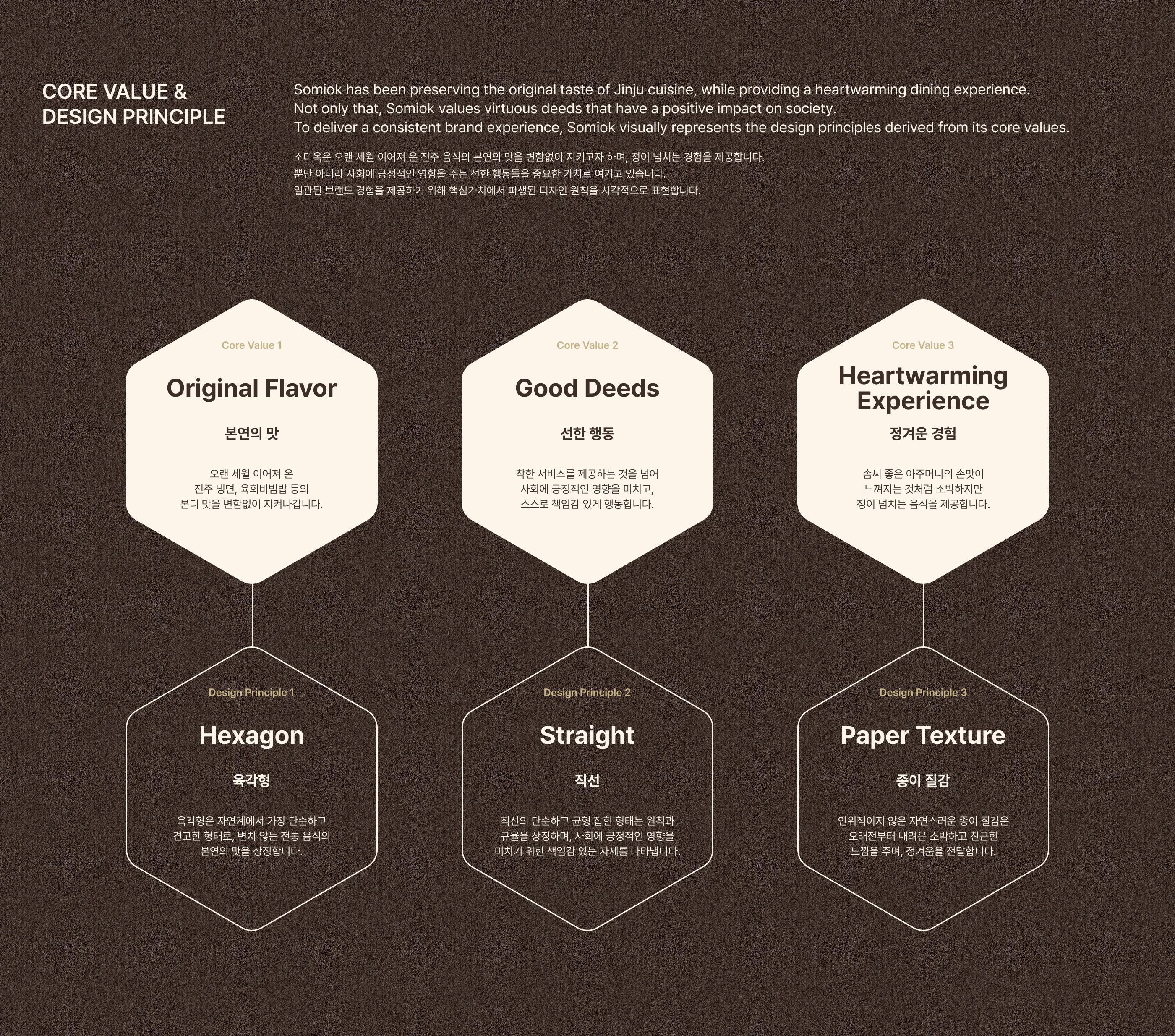 Overview Somiok is a restaurant that serves signature Jinju dishes like Jinju naengmyeon and Jinju yukhoe bibimbap that carry the original flavor of Jinju cuisine. Currently operating multiple chain stores in various areas, Somiok plans to continue expanding chains in the future. Accordingly, to establish a unique brand identity prior to expansion, we have launched this branding project. 소미옥은 진주 냉면, 진주 육회비빔밥 등 본디 진주 음식의 맛을 간직한 음식점입니다. 현재 여러 지역에서 체인점을 운영 중에 있으며, 앞으로 계속해서 체인점을 확장할 계획입니다. 이에 앞서 고유한 브랜드 아이덴티티 정립이 필요함에 따라 프로젝트를 진행하였습니다.