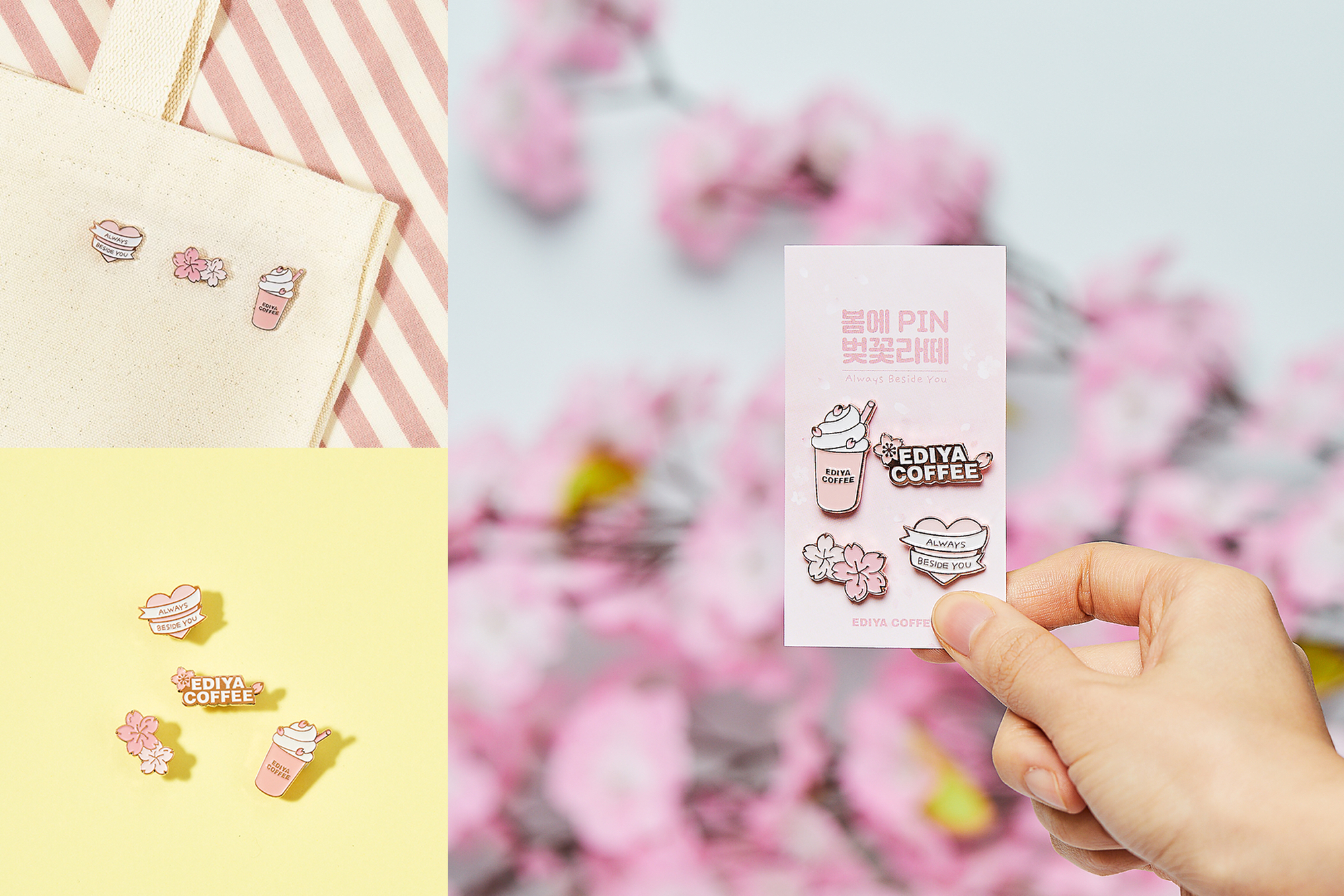 Overview 신제품 출시 이벤트용으로 만든 이디야만의 아이덴티티를 담은 한정판 뱃지 세트 입니다. 뱃지 세트는 총 4종으로 구성되어 있으며, 각 뱃지는 신제품 벚꽃라뗴를 형상화합니다. 뱃지마다 벚꽃의 색감과 모양을 사용하여 신제품 벚꽃라떼의 맛과 분위기를 표현하였습니다. 뱃지 세트는 한정 수량으로 제작되어 소장 가치가 높습니다.
